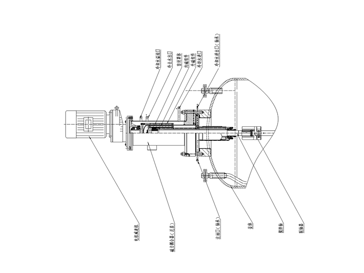 用稀土永磁制作的強(qiáng)磁回轉(zhuǎn)式耦合結(jié)構(gòu)(磁力驅(qū)動裝置),磁力驅(qū)動裝置的基本制造材料均為鐵磁性物質(zhì),磁導(dǎo)率極佳,磁場在穿過用于密封合金層時幾乎沒有損耗。由此外部驅(qū)動永磁體產(chǎn)生的旋轉(zhuǎn)磁場可以有效被內(nèi)部永磁體轉(zhuǎn)子接受,進(jìn)而帶動反應(yīng)器內(nèi)的攪拌部件進(jìn)行物料混合,攪拌速度為0~300r/min,甚至更高,可配推進(jìn)、槳式、錨式、框式、螺帶等各種槳。